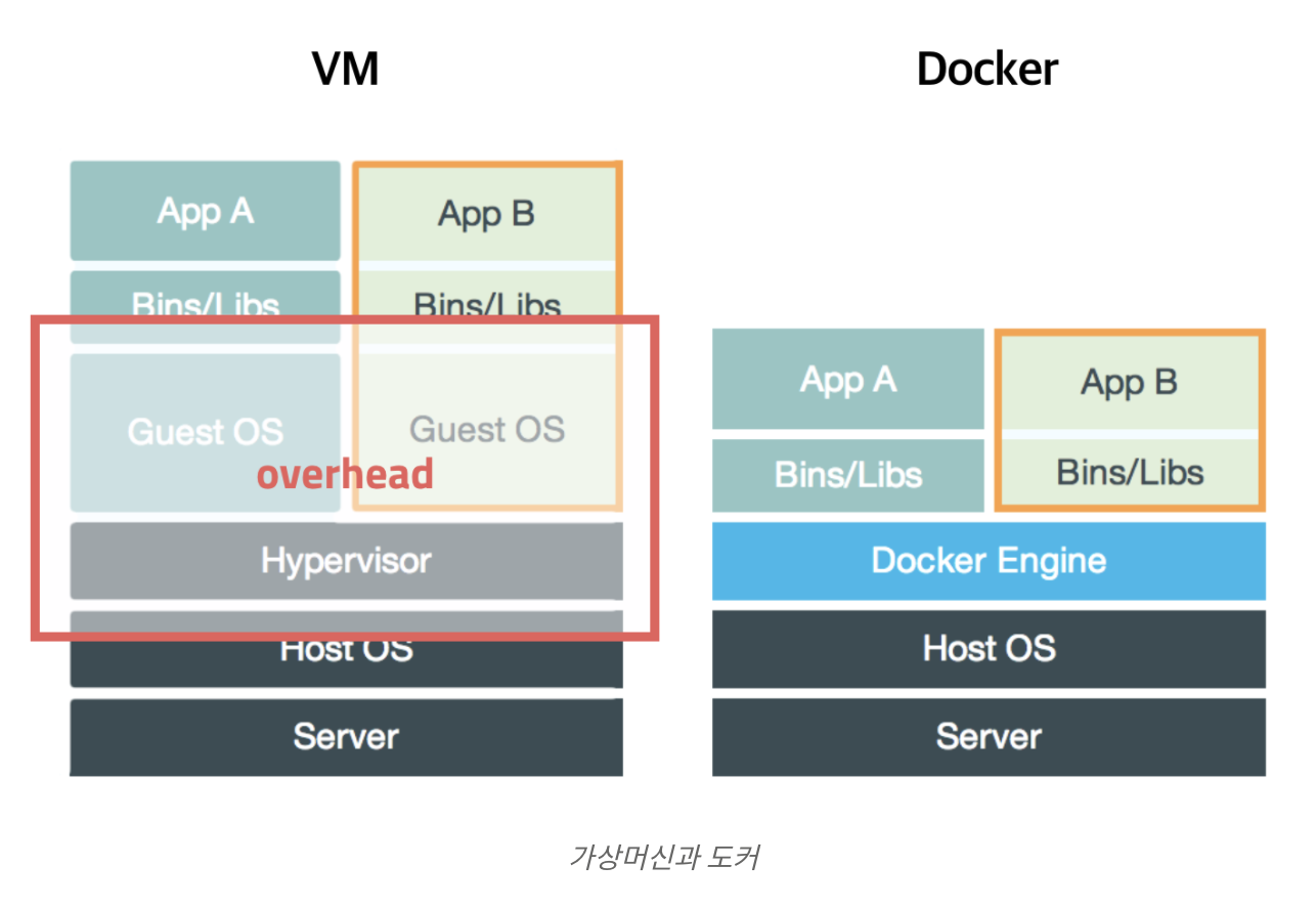 기존의 VMware나 VirtualBox를 이용한 가상화 방식은 호스트 OS 위에 게스트 OS 전체를 가상화하여 사용하는 방식입니다. 여러가지 OS를 가상화할 수 있고 비교적 사용법이 간단하지만 무겁고 느려서 운영환경에선 사용하기 어려웠습니다.