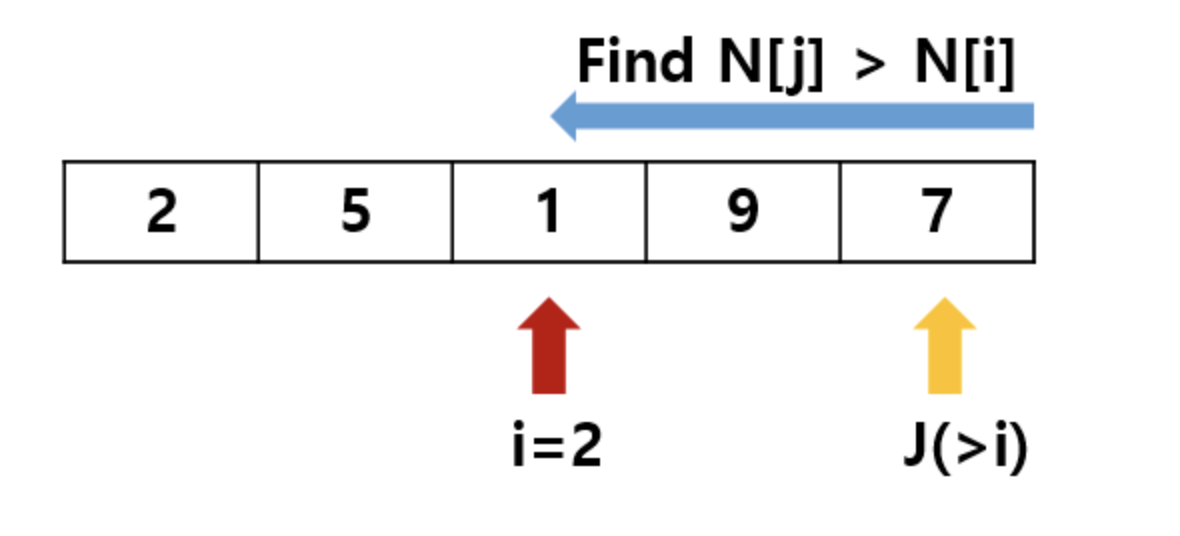 i를 구했으면 배열의 마지막부터 i까지 순회하면서 N[j] > N[i]를 만족하는 j값을 구합니다.