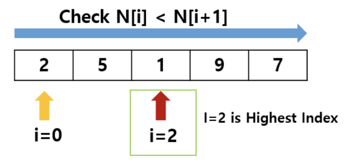 Greedy를 이용하여 N[i] < N[i + 1]을 만족하는 가장 마지막 i를 구합니다. 이 때, 만족하는 i가 없다면 해당 순열이 가장 마지막 순열임을 의미합니다.