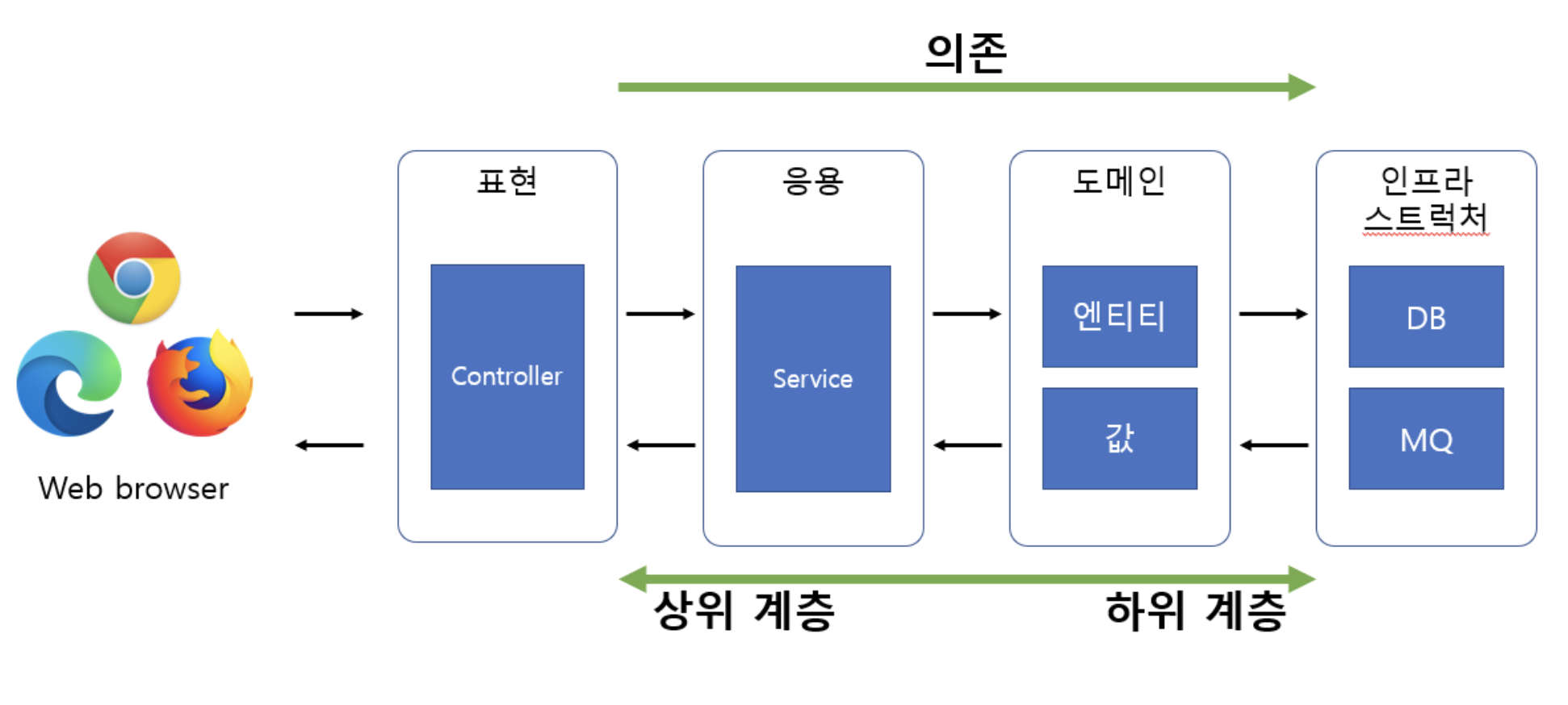 각 계층은 상위 계층이 하위 계층에 의존한 구조인데 이러한 구조는 '테스트의 어려움'과 '확장의 어려움'을 야기합니다.