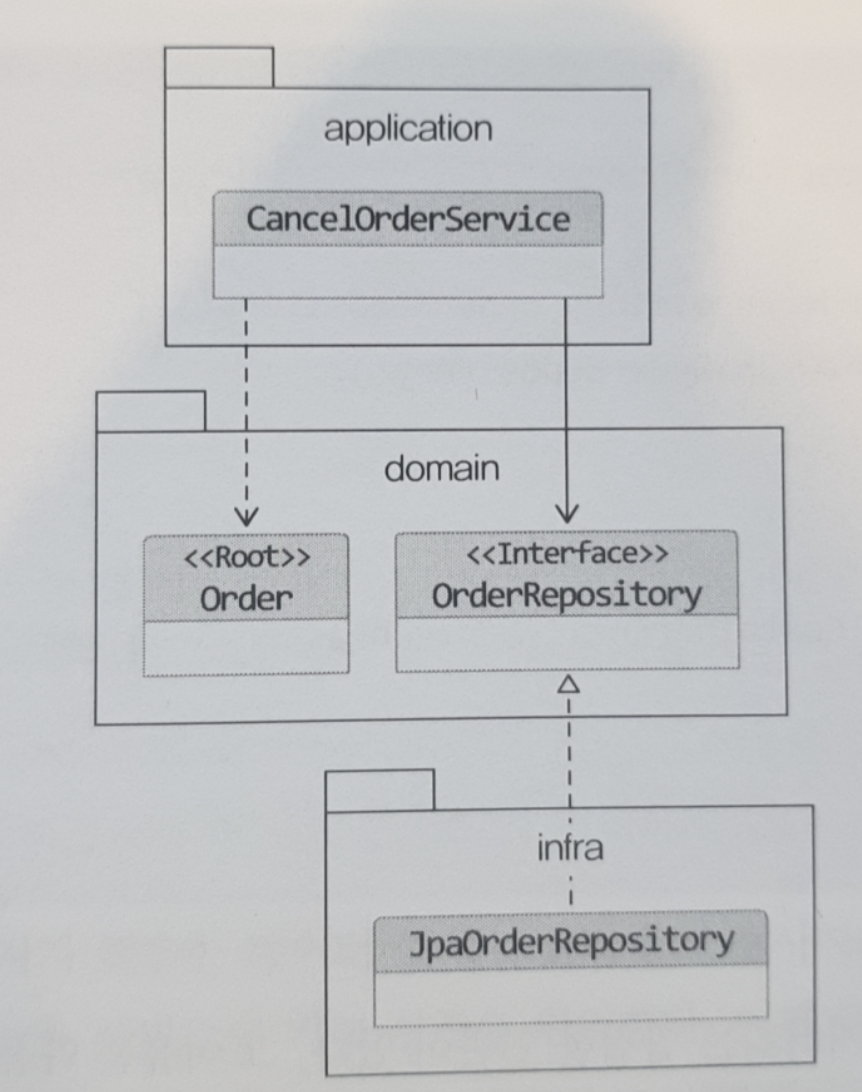 DIP 설계 원칙에 맞게 인프라 스트럭처의 JpaOrderRepository가 도메인 모델의 <<OrderRepository>>를 구현하게 하여,
