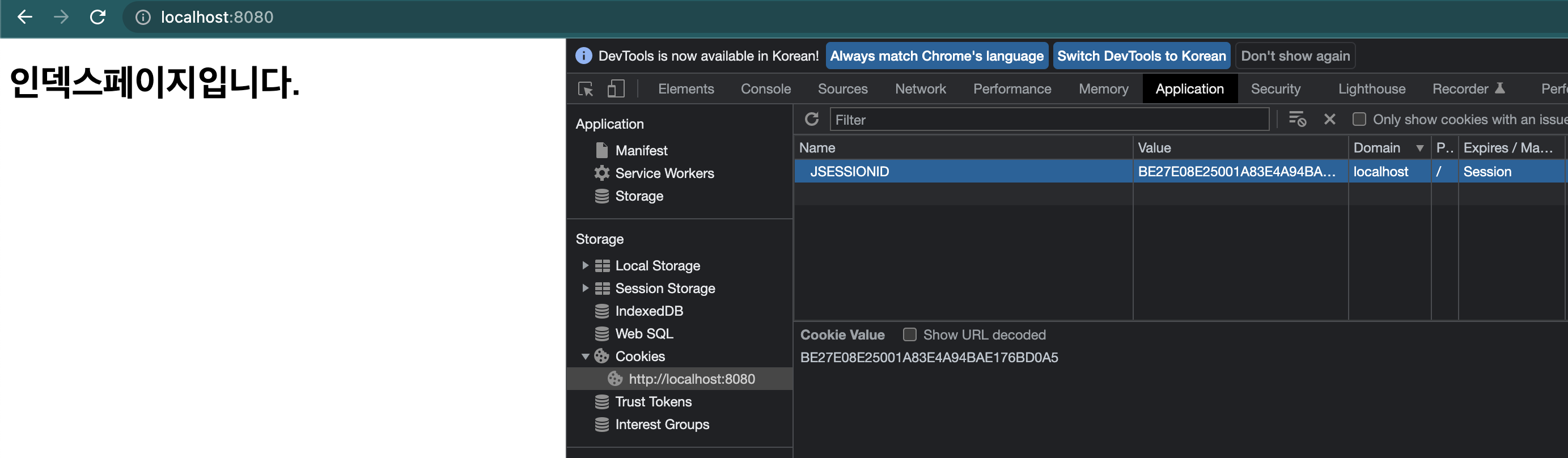 위와 같이 로그인후 브라우저의 메모리 영역에 JSESSIONID라는 이름의 쿠키가 저장된 것을 확인할 수 있다.