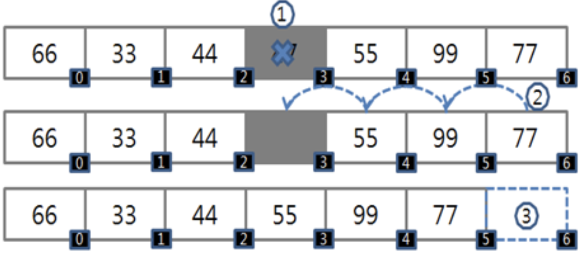 - index 3 이후 값들을 왼쪽으로 한 칸씩 이동(복사후 덮어쓰기)